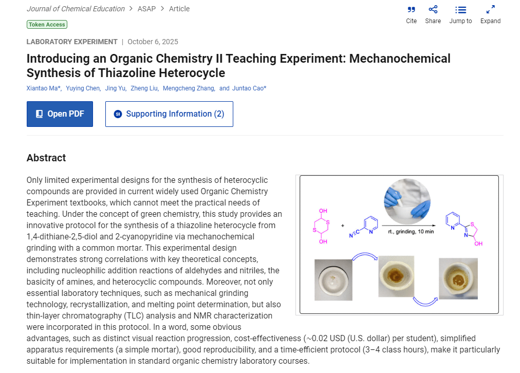 近日,我院马献涛博士、曹俊涛教授团队在化学教育国际顶级期刊 Journal of Chemical Education 发表了题为"Introducing an Organic Chemistry II Teaching Experiment: Mechanochemical Synthesis of Thiazoline Heterocycle"(J. Chem. Educ. 2025,DOI: 10.1021/acs.jchemed.5c00768)的最新教研成果。这是该教研团队自2024年以我校为第一单位首次在该期刊发表教研论文(J. Chem. Educ. 2024, 101, 2493−2497)之后的又一重要成果。