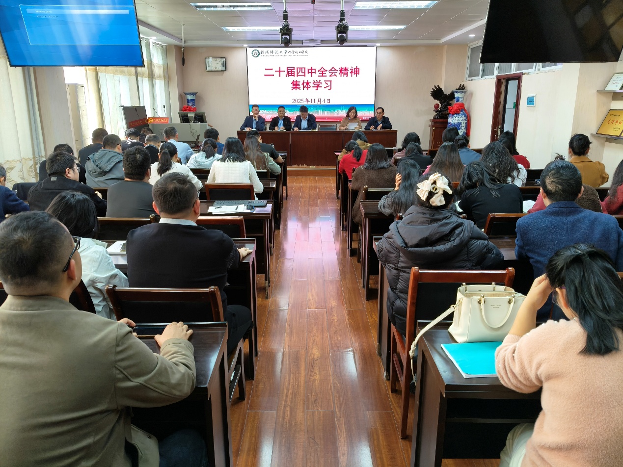 会议指出,党的二十届四中全会是“十四五”规划收官、开启“十五五”新征程的关键会议,对未来五年发展作出顶层设计和战略擘画,必将对党和国家事业发展产生重大深远影响,也为学院未来发展指明了前进方向。一是要把学习贯彻党的二十届四中全会精神作为当前和今后一个时期的重要政治任务,坚持融会贯通学、联系实际学、深入思考学,把学习成果转化为谋划发展的清晰思路、促进发展的具体举措。二是要瞄准科技前沿和关键领域,加强科研项目技术申报,力争在核心领域取得突破,为发展新质生产力、实现高水平科技自立自强贡献力量。三是要坚定实施学校“123344”工作思路和改革举措,加强党的全面领导,落实立德树人根本任务,将全会精神融入教育教学全过程,推动学院学科、科研、人才工作深度融合、协同发展。