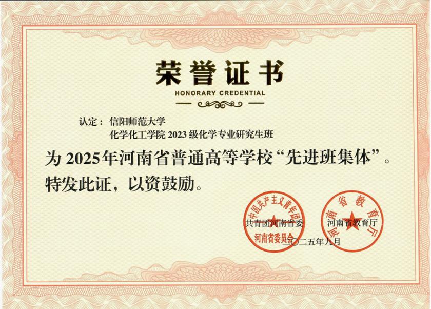 近日,共青团河南省委、河南省教育厅公布了2025年“河南省普通高等学校‘先进班集体’”的认定结果,我院2023级化学专业研究生班凭借出色的综合表现,从众多参评单位中脱颖而出,荣获这一省级荣誉称号。