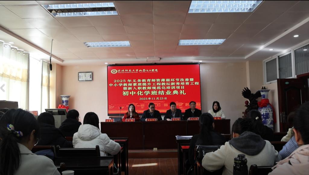 11月23日,2025年河南省义务教育师资薄弱环节改善暨中小学教师素质提升工程教坛新秀培育工程暨新入职教师规范化培训项目初中化学班结业典礼在化学楼407会议室顺利举行。学院党委书记吴志伟、副院长王红军,项目负责人沈久明及研修班班主任章艳、万榕出席典礼,典礼由王红军主持。