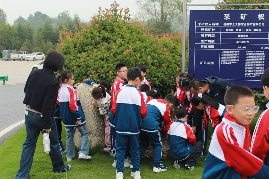 9月21日,作为首届科普月“延伸实践”环节,孩子们带着展馆里的疑问,走进信阳市上天梯采矿区与上天梯怡和矿产资源有限公司,开启“寻找答案”的旅程。刚踏入矿区安全区域,工作人员手中的珍珠岩、膨润土原矿就吸引了所有人的目光:“这和展馆里的标本一模一样!”孩子们迫不及待地接过原矿,触摸着“沙沙的质感”“柔软的质地”,脑海中瞬间串联起科普月首站学到的“火山成因”知识,“原来课本里的地质故事,就发生在咱们家乡!”
